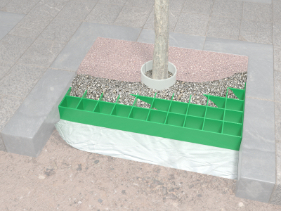 Cantero de infiltración formado por geotextil de polipropileno, (120 g/m²), rejilla alveolar de polietileno de alta densidad estable a los rayos UV, de 73x73x7 cm, color verde y relleno de las celdas con grava filtrante sin clasificar, para tráfico peatonal, con una resistencia a flexotracción de 3 N/mm², una resistencia a compresión de 6 N/mm² y una capacidad drenante >=150 l/(m²·min), resistencia al deslizamiento alta.
