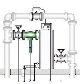 Descalcificador compacto con mando por tiempo de tres ciclos, caudal de 0,3 m³/h, con llaves de paso de compuerta. | ||