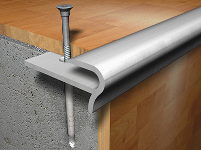 Remate curvo de peldaño con revestimiento laminado o de madera, mediante perfil de aluminio anodizado, de 8 mm de altura, color plata, fijado mecánicamente.